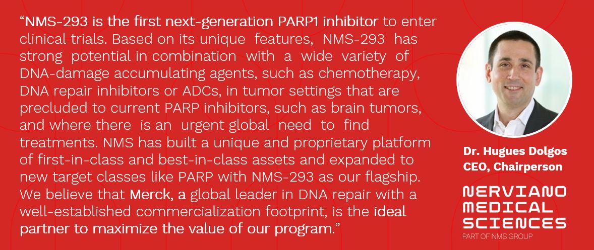 “NMS-293 is the first next-generation PARP1 inhibitor to enter clinical trials. Based on its unique features, NMS-293 has strong potential in combination with a wide variety of DNA-damage accumulating agents, such as chemotherapy, DNA repair inhibitors or ADCs, in tumor settings that are precluded to current PARP inhibitors, such as brain tumors, and where there is an urgent global need to find treatments,” stated Hugues Dolgos, Pharm.D., chief executive officer of NMS and NMS Group. “NMS has built a unique and proprietary platform of first-in-class and best-in-class assets and expanded to new target classes like PARP with NMS-293 as our flagship. We believe that Merck, a global leader in DNA repair with a well-established commercialization footprint, is the ideal partner to maximize the value of our program.”