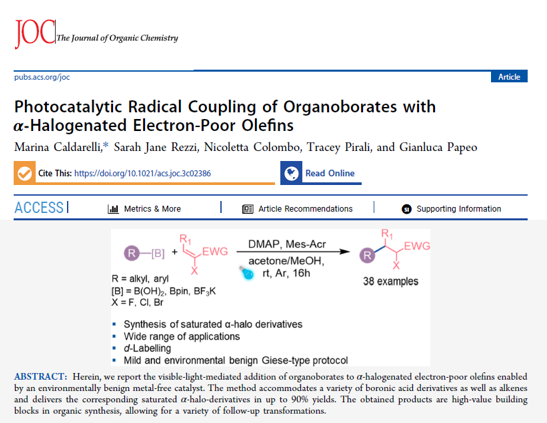 Nerviano Medical Sciences Srl (NMS) is pleased to announce the publication of the hot-off-the-press article “Photocatalytic Radical Coupling of Organoborates with α-Halogenated Electron-Poor Olefins” published in The Journal of Organic Chemistry (https://doi.org/10.1021/acs.joc.3c02386) .